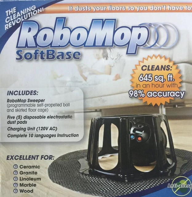 Now the robomop s battery is dead after 45 minutes on a full charge and does little else besides go in one direction for a few inches before going in the other direction over and over. In case you didn t get it from the name the robomop is like the robot vacuum except it mops the floor with water. It has a plastic skirt that you attach a dusting pad to it. There is a black ball that you place in the middle of the skirt that maneuvers the duster around.